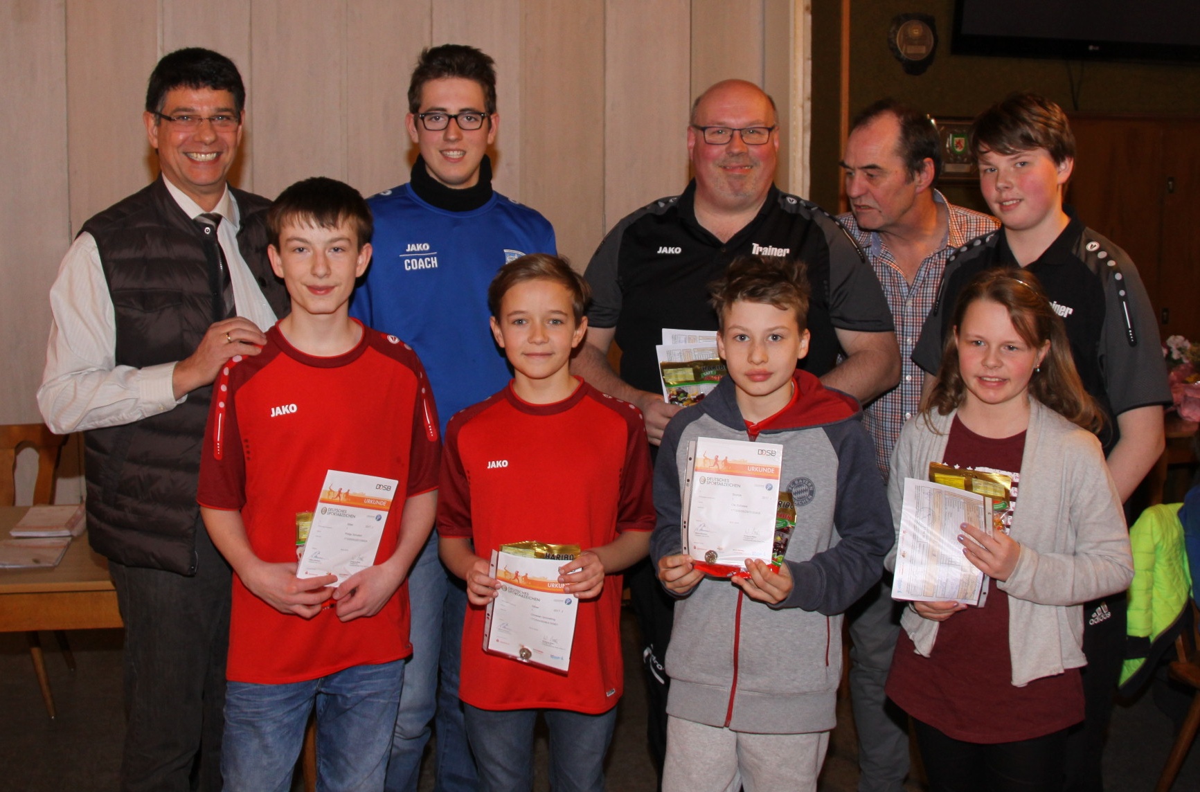 vlnr hintere Reihe: Bürgermeister Klaus Schumacher, Tim Gartzke, Abteilungsleiter Stefan Neuenhofen, Vereinsvorsitzender Herbert Homge, Assistenztrainer Tiberius Neuenhofen